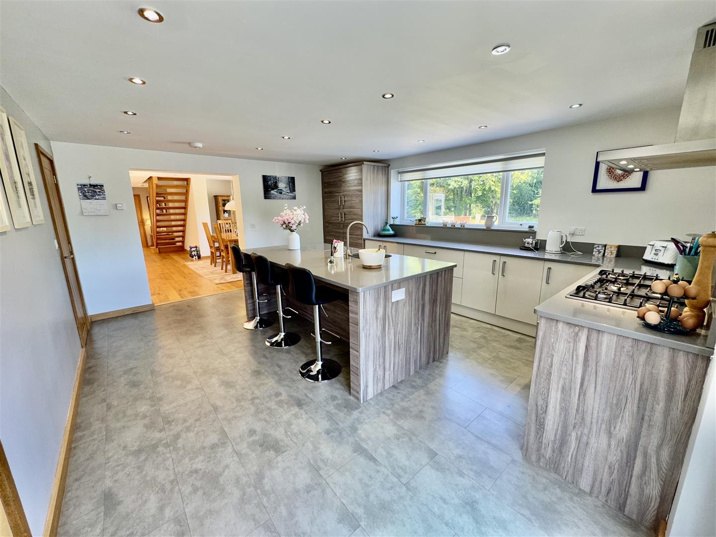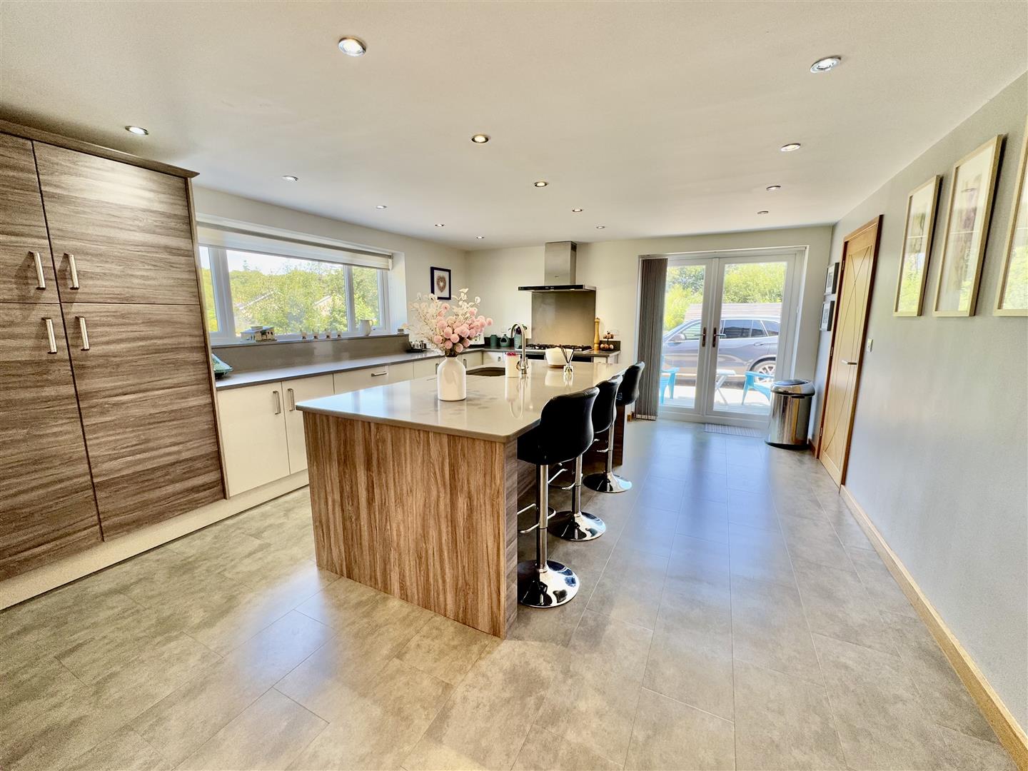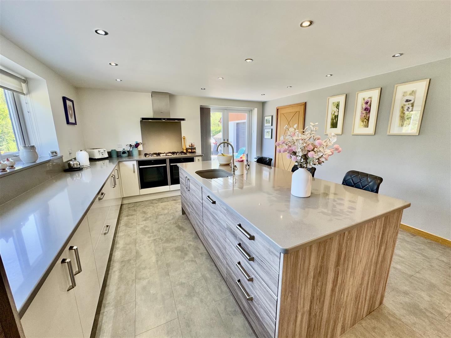 Modern fitted kitchen, granite worktops and large island with sink and seating area. Double oven with gas hobs. Patio door to raised patio seating area.