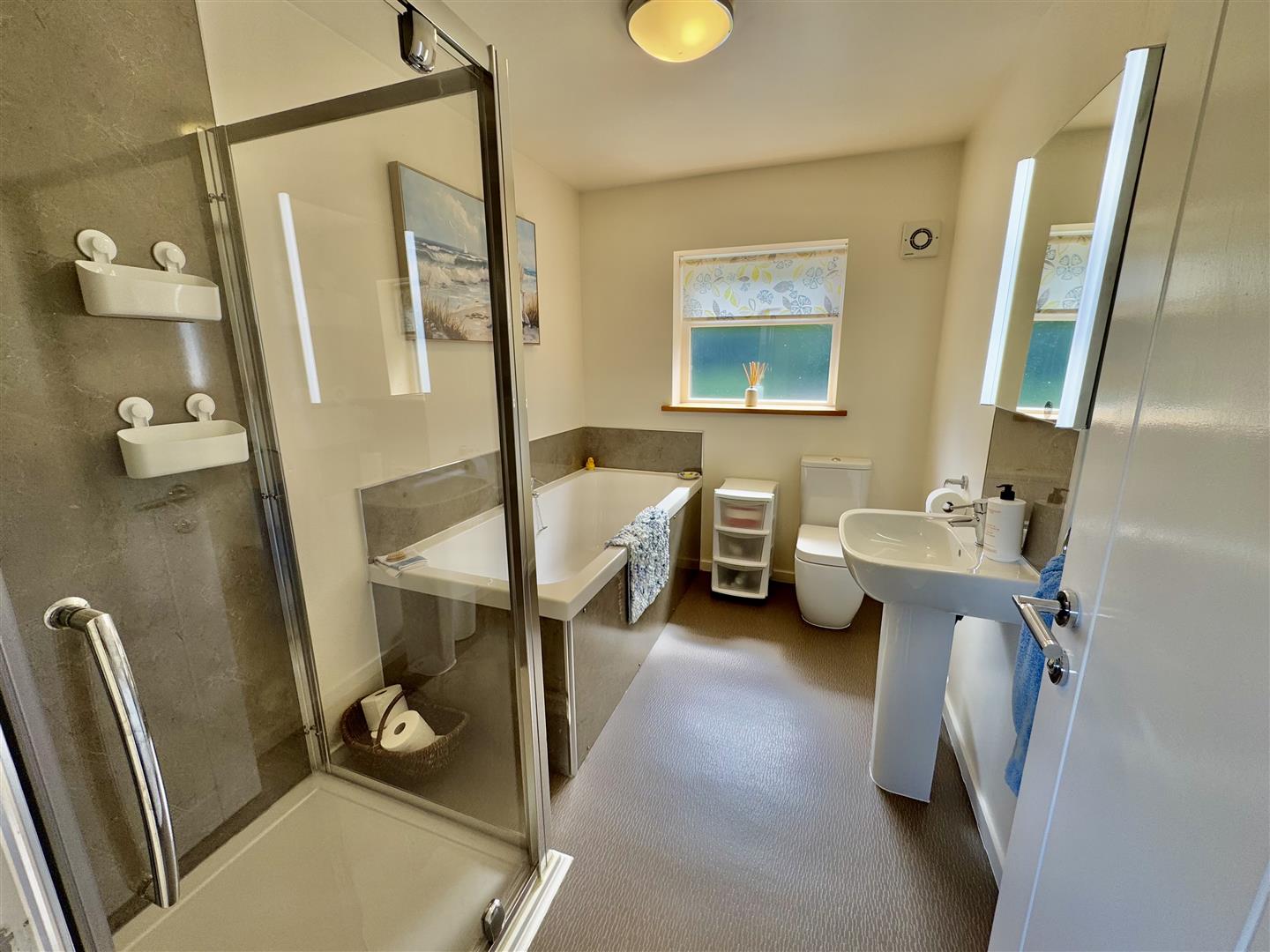 Vanity washbasin and low level w.c. unit. Walk-in shower cubicle. Towel radiator.